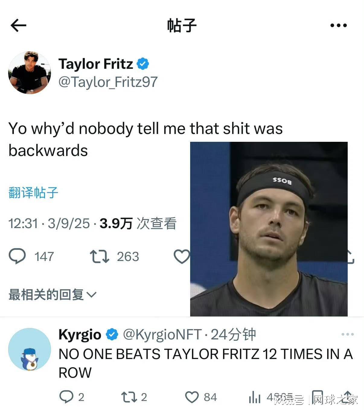 弗里茨赛后在个人社交媒体平台上发文:“为什么没人告诉我这B发带我戴反了。”这条动态引发网友热议。